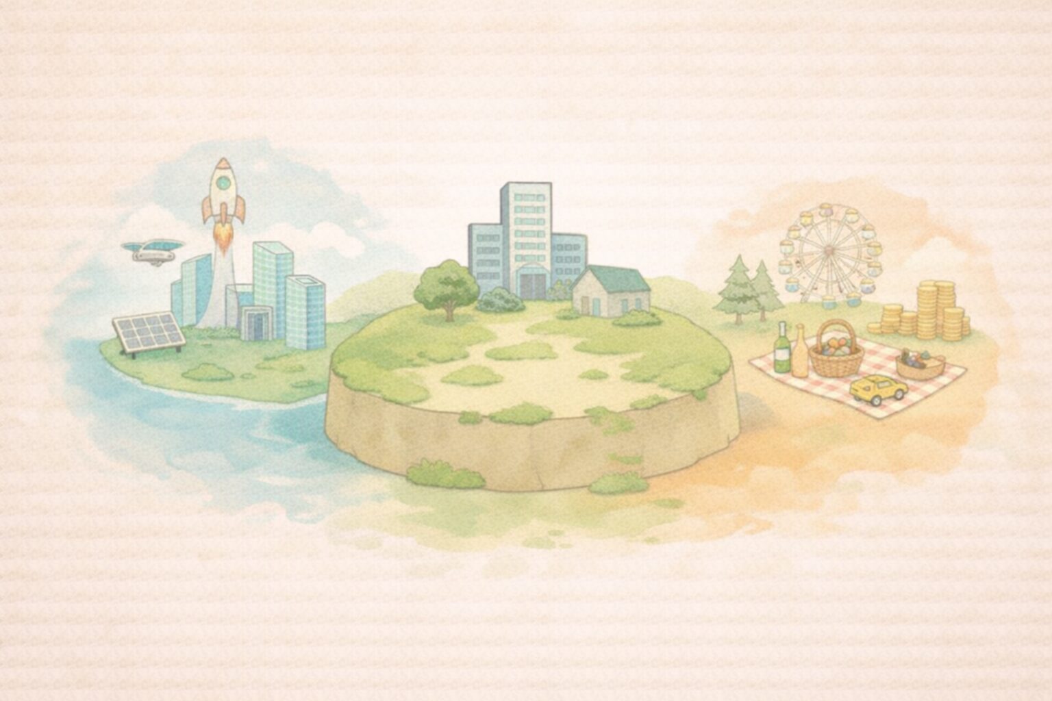 ETFは、役割ごとに“居場所”が違う。 土台・ワクワク・ごほうびを分けて考えるイメージ。